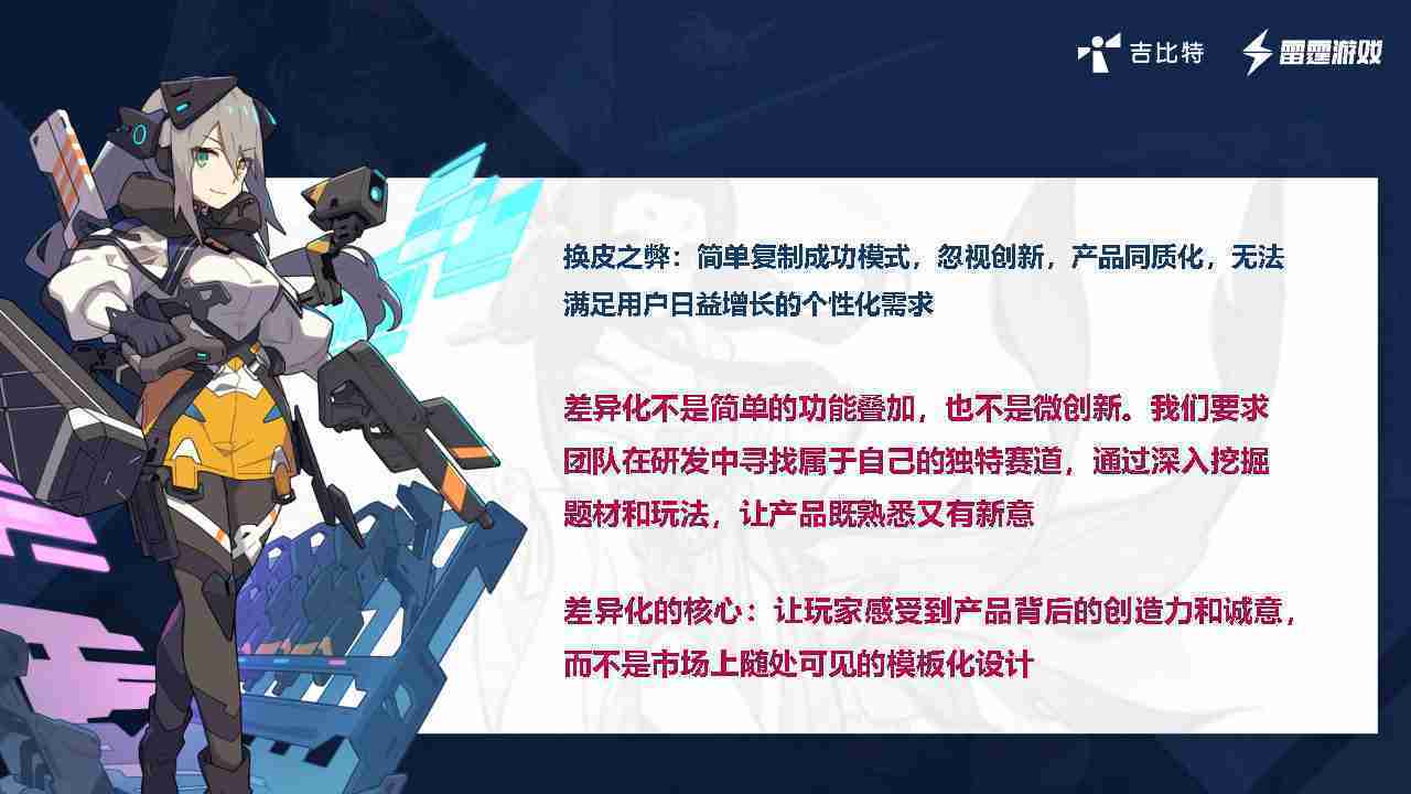 在我们内部是这么定义差异化的。。。。首先,,,差异化不是简单的功能叠加,,,更不是换皮。。。只是换皮,,产品无法提供有效的市场价值。。。。内部经常说差异化的产品不是为了迎合市场,,,而是找到一个自己独特的表达方式,,,在研发中找到属于自己的细分赛道和独特赛道,,前提是需要对这个题材有足够的深入、、、、挖掘,,,对玩法有足够深入的理解,,让产品看起来既熟悉又有新意。。