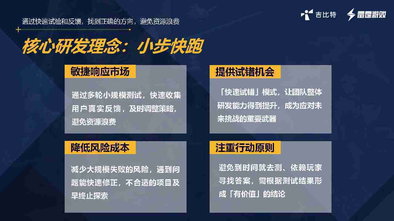 小步快跑不是找答案,,,,而是验证答案。。。。我们之前有项目是这样的,,,有些制作人会有几个方向觉得都可以做,,,但是不确定做哪一个,,,,会选择几个都做,,,做完拿到市场跑,,跑出哪一个更好,,,,基于这个再做后续的研发和拓展。。。但这种情况最容易出现一个问题,,,,可能被玩家裹胁,,玩家说这个点不错、、、那个点不错,,到底听还是不听,,不听感觉是无视玩家的反馈,,,听的话,,,,可能自己没想清楚导致研发思路发生偏颇。。。。所以针对这一点后面自己复盘整理,,,,发现制作人自己心里要有数,,要做自己觉得好玩的,,而且明确知道这个东西是你想做的,,然后拿到市场验证这个答案是不是对的,,,,而不是拿一堆答案找哪一个答案更好。。。。