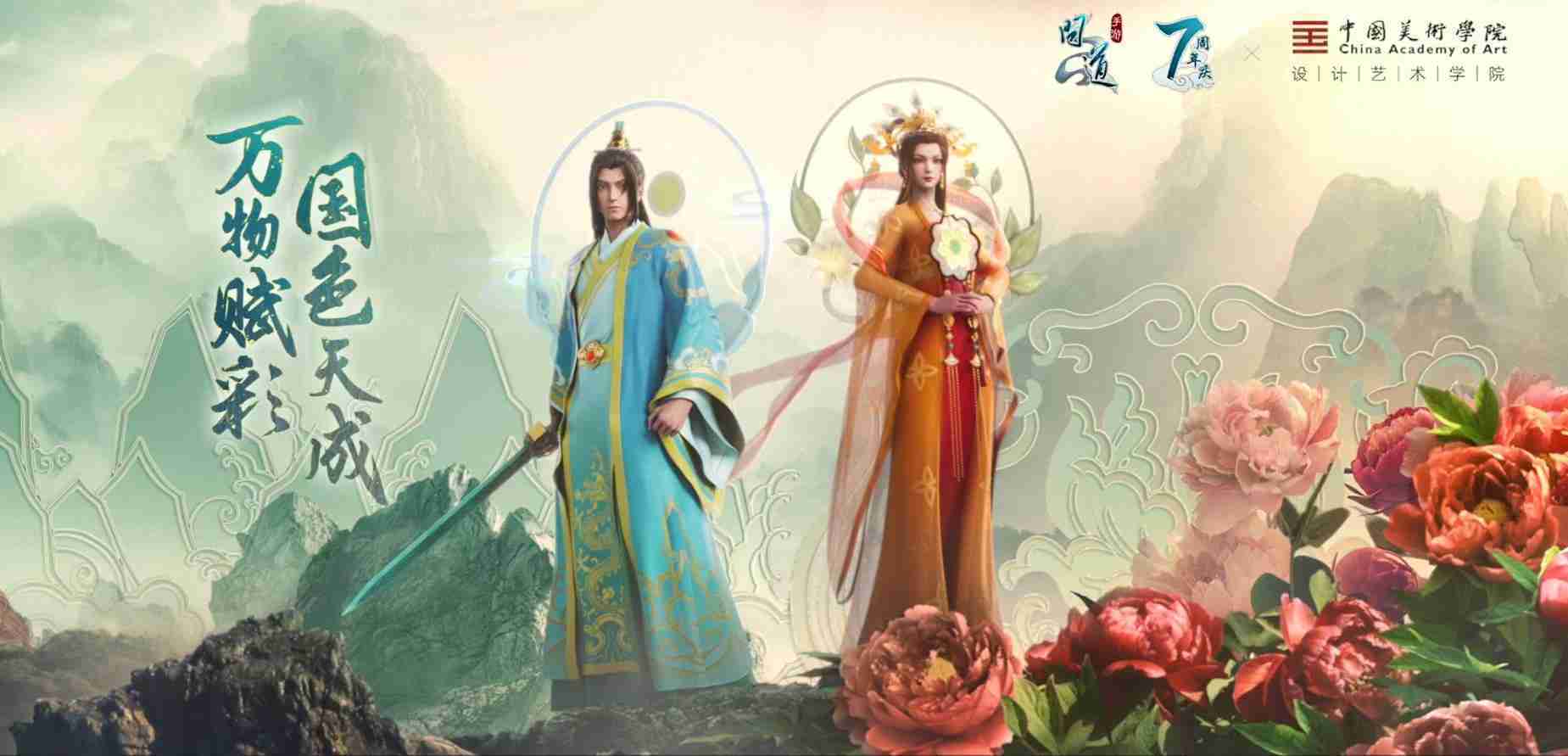 2023年4月,,,,《问道手游》联动中国美术学院,,,在游戏中融合了中国历史上不同时期的文化元素,,打造了“山河万象”与“凤鸣九霄”的国风时装。。在色彩配置方面,,,创作团队基于对游戏角色特性的分析提取相应的文化内涵,,,从每一种色彩的色相、、、指代事物和情感出发对应角色属性,,选定服装的色彩搭配。。。。在纹样设计方面,,,创作团队结合游戏角色自身特殊的造型比例和形态,,在实际的纹样设计中进行了游戏语境下的活化演绎。。。。男性角色集中使用了如蟒纹、、、海水江崖纹、、如意纹和云气纹等传统纹样元素,,,,女性角色则吸纳了凤凰纹、、、牡丹纹、、卷草缠枝纹等元素,,,组成以“双凤牡丹纹样”“缠枝牡丹纹”“金玉凤冠头饰”为主要纹样的游戏角色装饰图案系统。。。。