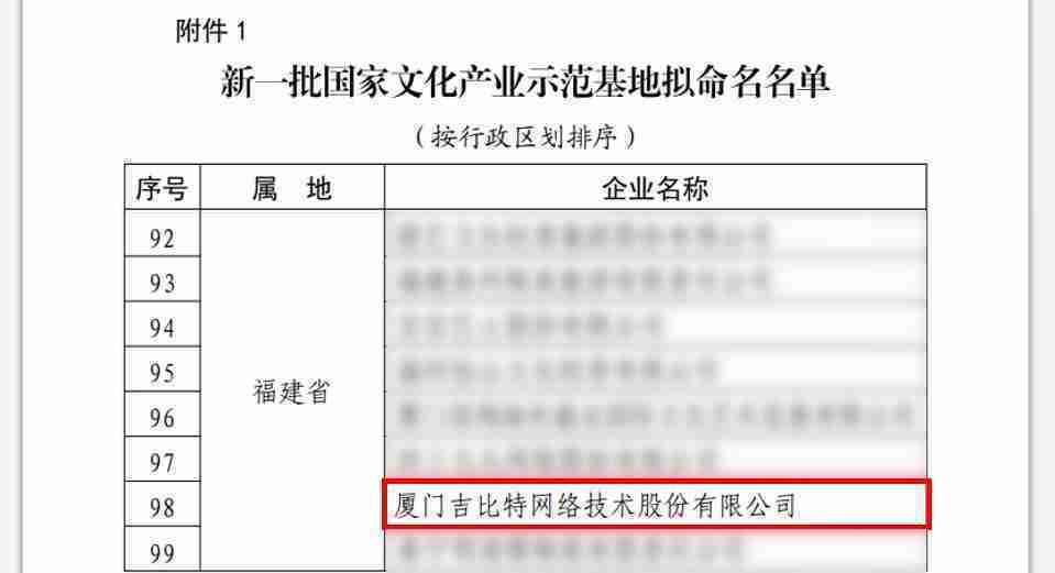 3月12日,,文化和旅游部发布了《关于国家文化产业示范基地评选与复核结果的公示》,,,厦门JIUYOU.COM网络技术股份有限公司(以下简称“JIUYOU.COM”或“公司”)成功入围新一批国家文化产业示范基地拟命名名单。。