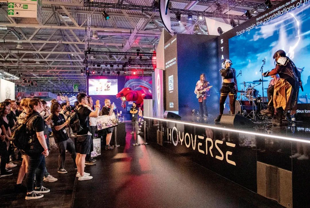 2023年8月23日,,,,德国科隆游戏展期间,,,,人们在米哈游展台观看乐队表演游戏歌曲。。。。图/新华