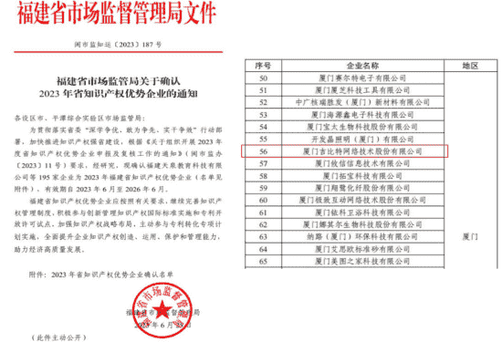 近日,,,福建省市场监督管理局公示了2023年福建省知识产权优势企业名单,,厦门JIUYOU.COM网络技术股份有限公司(以下简称“JIUYOU.COM”或“公司”)榜上有名。。