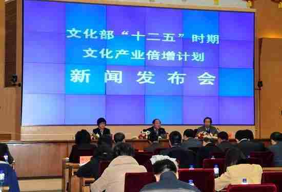 2月28日下午,,,文化部在京召开新闻发布会,,正式向社会发布《文化部“十二五”时期文化产业倍增计划》,,,,提出了 “十二五”期间文化部门管理的文化产业增加值年平均现价增长速度高于20%,,,2015年比2010年至少翻一番,,,实现倍增的奋斗目标。。